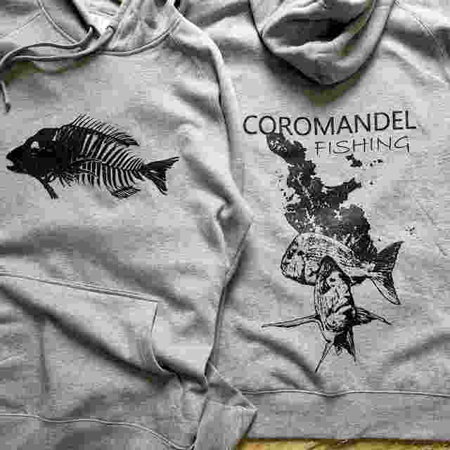 Hoodie (front and rear prints) Coromandel Fishing and Snapper Fern Skeleton - Grey Marle