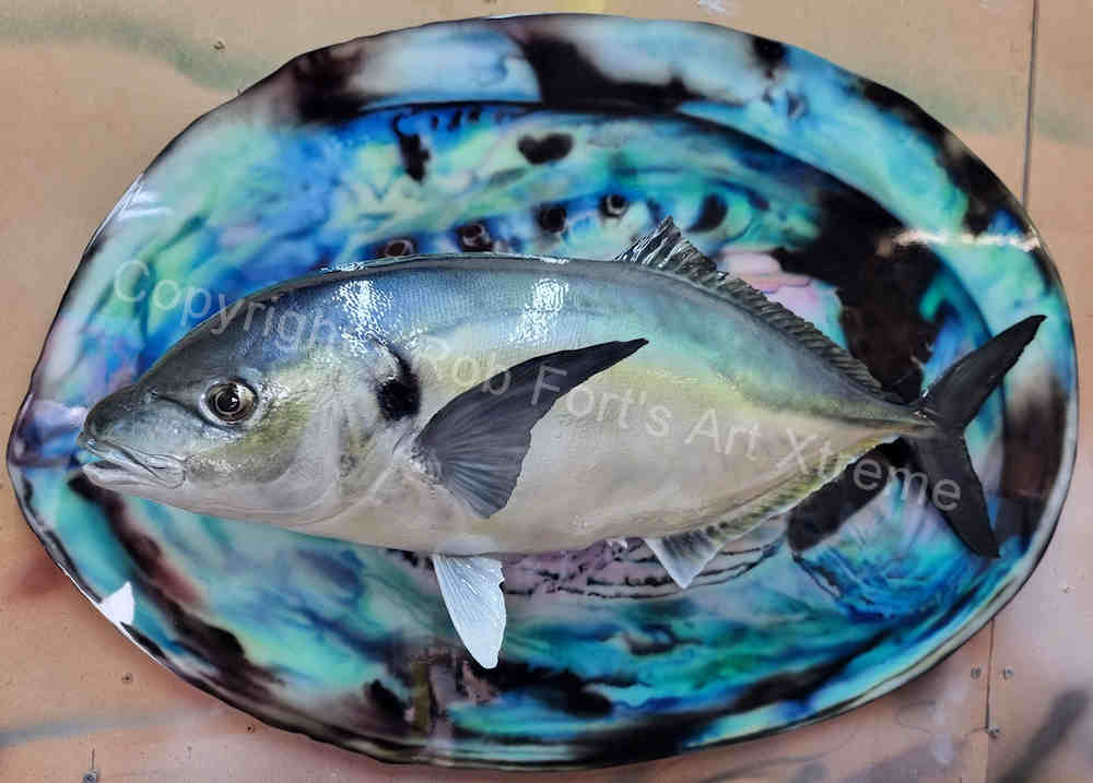 Custom 2D and 3D Fish Art Sculpture - Airbrushed trevally fish replica and paua background cut out